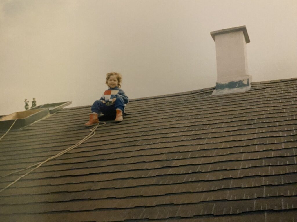 Jizvu přes půl palce mám dodnes, ale strach z ostrých nožů a nástrojů obecně ne. Nikdo mi totiž nic nevyčítal a nestrašil mě, jak moc je to nebezpečný. Naopak. Když byl palec ošetřený, probrali jsme s taťkou co se přesně stalo, kde byla chyba a jak se tomu příště vyvarovat. Nejlepší škola. Dokonce i teď, když pracuju třeba s ostrým dlátem (nebo lezu ve výškách – viz foto), jsem si zatraceně dobře vědomá, co se může stát a cíleně tomu předcházím – pracuji směrem od sebe a materiál mám pevně uchycený. Kožené rukavice v některých případech také nejsou k zahození. V každém pohybu počítám s tím, že mi dláto může sklouznout a dbám na to, abych v tom místě neměla žádnou část těla 🙂